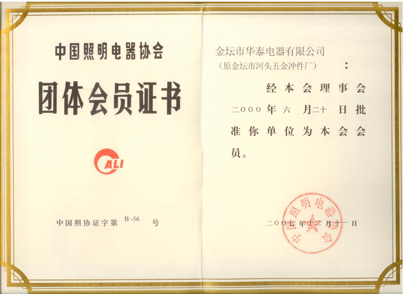 中國照明電器協會會員證書